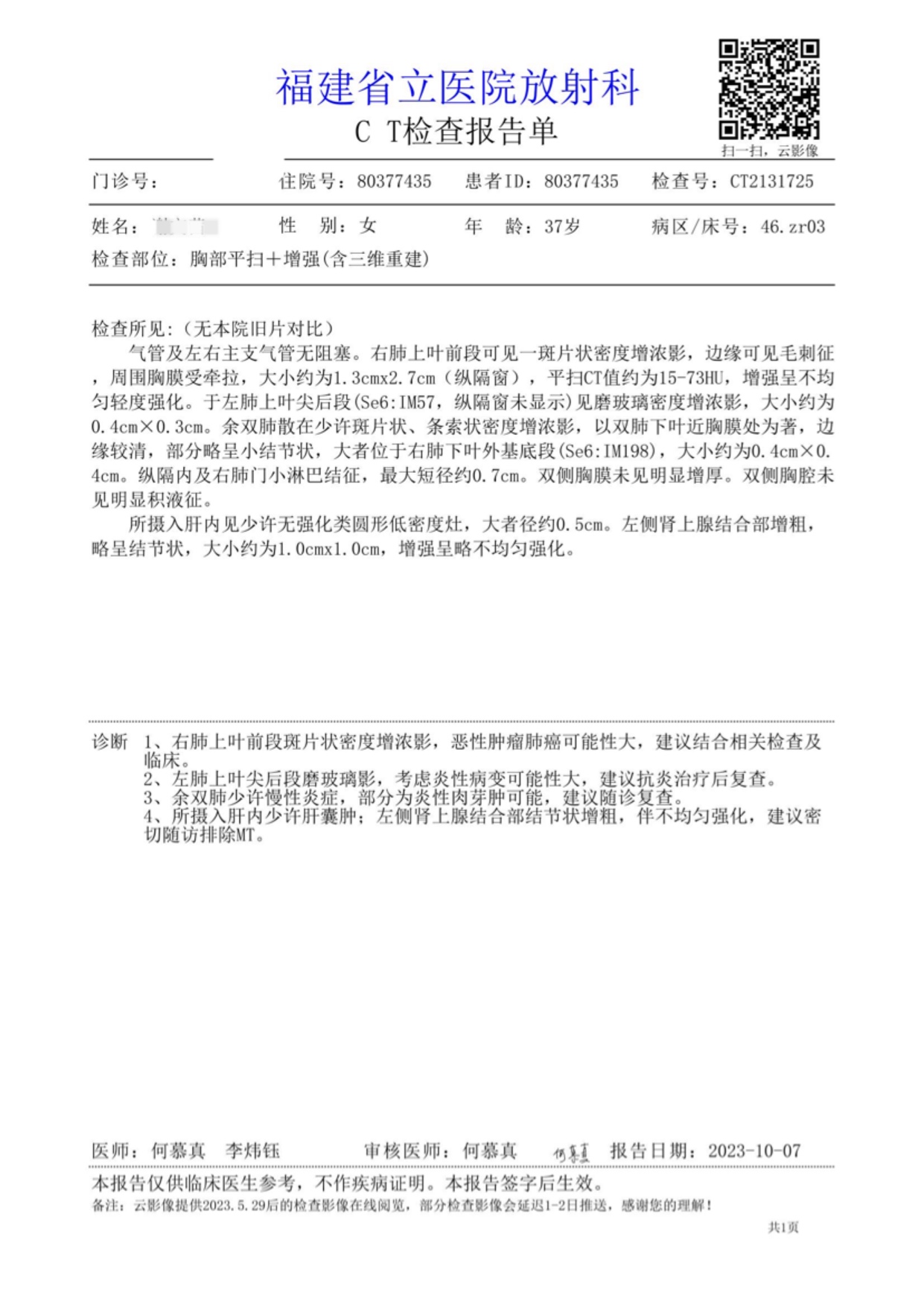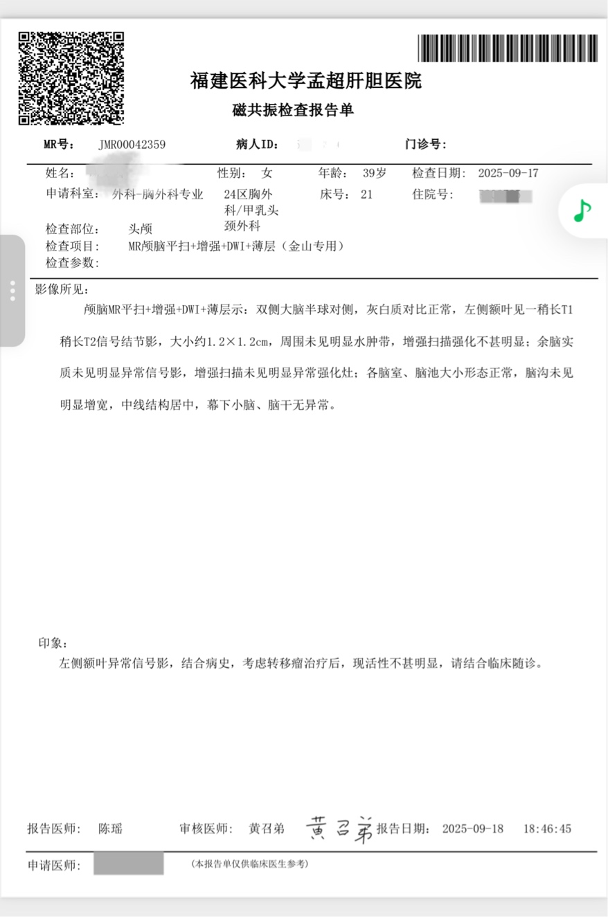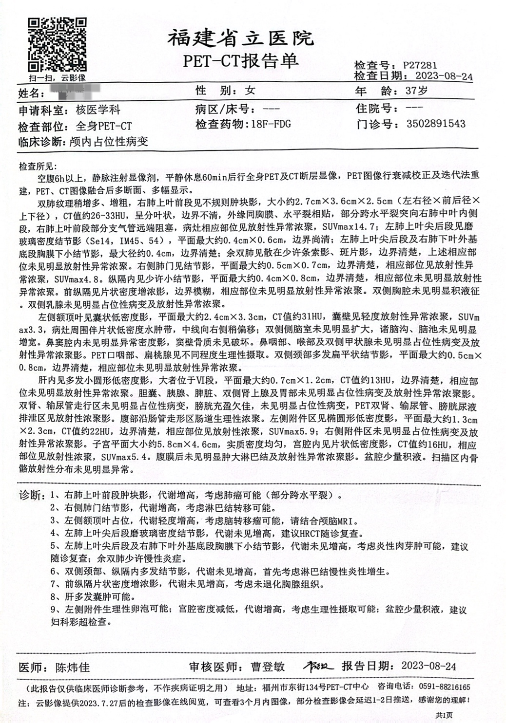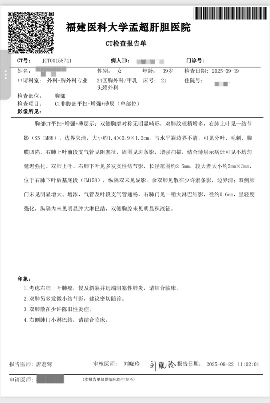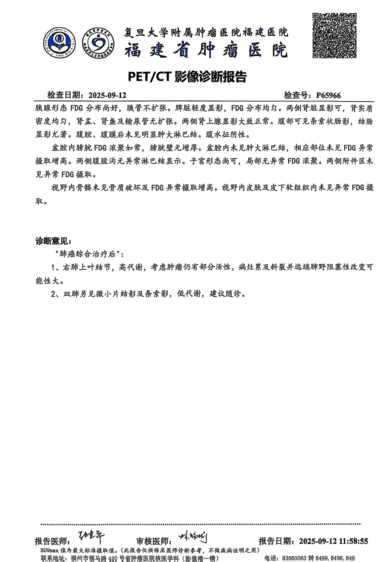 闯关3AN2 发表于 2025-09-23 09:20 能否手术一定是胸外科医生看片子评估的。你辛苦地打了不少文字来试图说明白自己的病情,只是,这都是你自己理解的相关信息,你不理解的和评估有关的文字你都略掉了。。。。建议你直接把上面几个影像报告照片发出来,特别是pet Ct的,虽然比不了影像,也总比你自己写的信息详细。